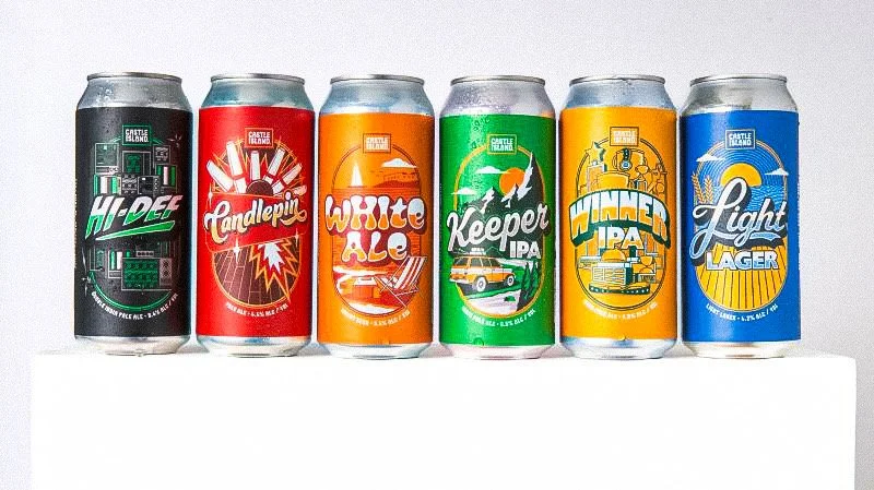 Ray is no stranger to rebranding a business. He single-handedly redesigned and reimagined Castle Island Brewing's identity in 2024. The brand needed a refresh that spoke better to who they were and what they represented. Ray took that information and transformed each can into an illustration of what to expect off that first sip. Whether you're being blasted from the Hi-Def tanks with a juicy burst of tropical hops or finding your own adventure in the Keeper, the branding hones in on that happy place with each design. The color-way of the original cans remained the focus for consumer consistency during the makeover The new pill shape framing creates total brand cohesiveness among the core cans and limited releases alike.